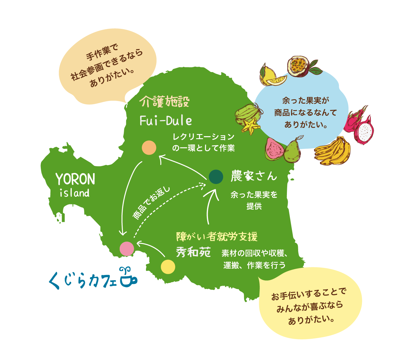 農家さんから集めたグアバなどの果実やハーブは、介護施設のFui-Dule(フゥイ–ドゥール)さんへ。